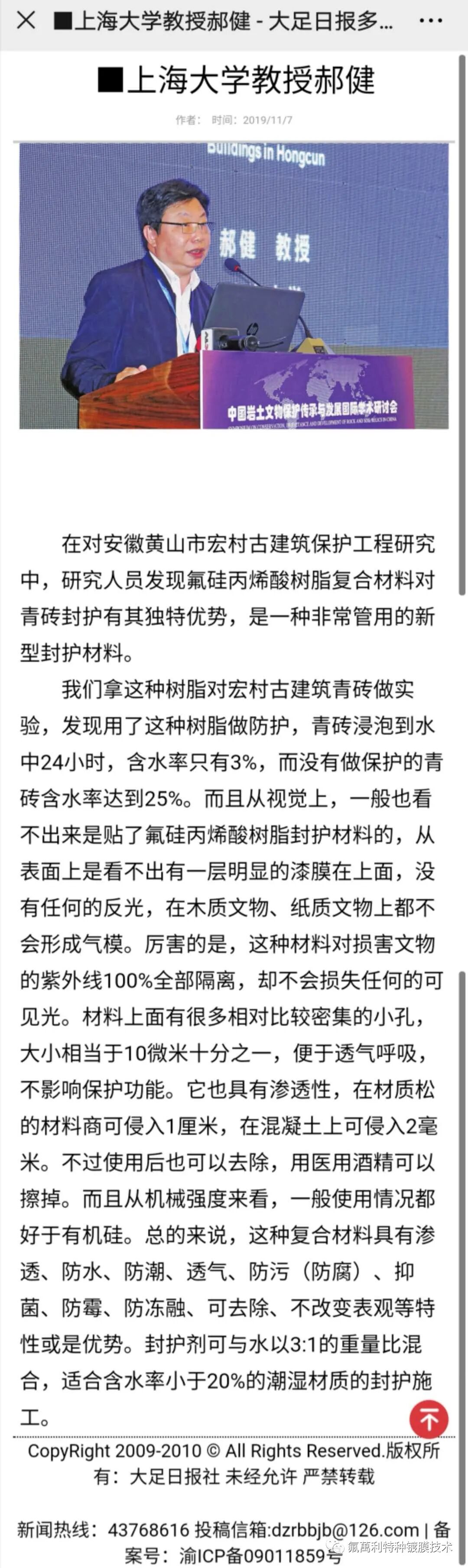 大足日报记者专门撰文,对包括郝健教授在内的多位国内外知名学者的研究工作进行了独立报道。这也是氟萬利®特种镀膜技术首次在国内高等级大型文物保护大会上进行展示,受到与会代表的广泛关注与好评,也为此项技术未来在文物保护,特别是古建筑保护领域的商业化应用奠定了基础。